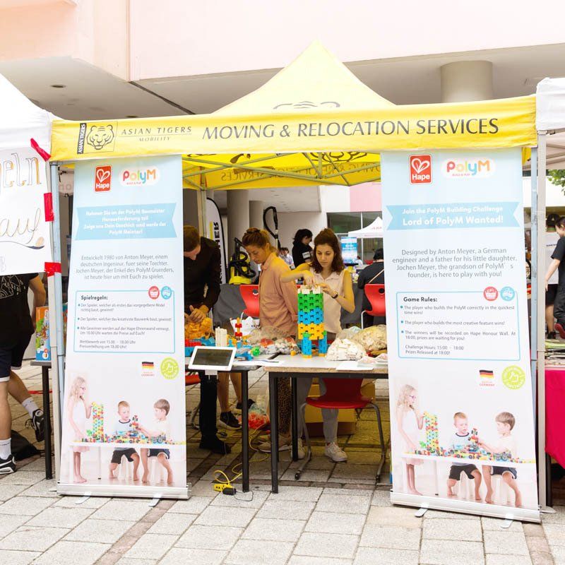 Wie im Vorjahr zog das Willkommensfest mit seinen Live-Shows, spannenden Spielen und leckerem deutschen Essen zahlreiche Kinder und Eltern an. Hape beteiligte sich als Mitglied der Deutschen Außenhandelskammer Shanghai erneut an dieser schönen Veranstaltung und präsentierte in diesem Jahr das deutsche Baustein-System PolyM. Beim Wettbewerb sollten die Kinder nicht anhand einer Anleitung ein bestimmtes Spielzeug bauen, sondern durften ihrer Fantasie freien Lauf lassen und ihre eigenen Ideen präsentieren. Die Kinder waren davon begeistert und bauten mit Feuereifer ihre eigenen PolyM-Kreationen. Natürlich wollten auch die Eltern sehen, wie fantasievoll ihre Kinder die PolyM-Bausteine kombinierten. Dabei ging es fröhlich und laut zu – der PolyM-Wettbewerb zu Schuljahresanfang war ein voller Erfolg. Am Ende wurden die Hauptpreise – ein Set mit Stadtfahrzeugen und eine Abenteuer-Mondrakete – an zwei Kinder vergeben, die sich besonders kreativ gezeigt hatten.